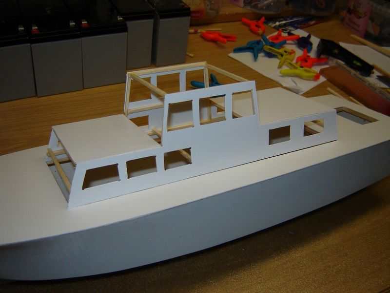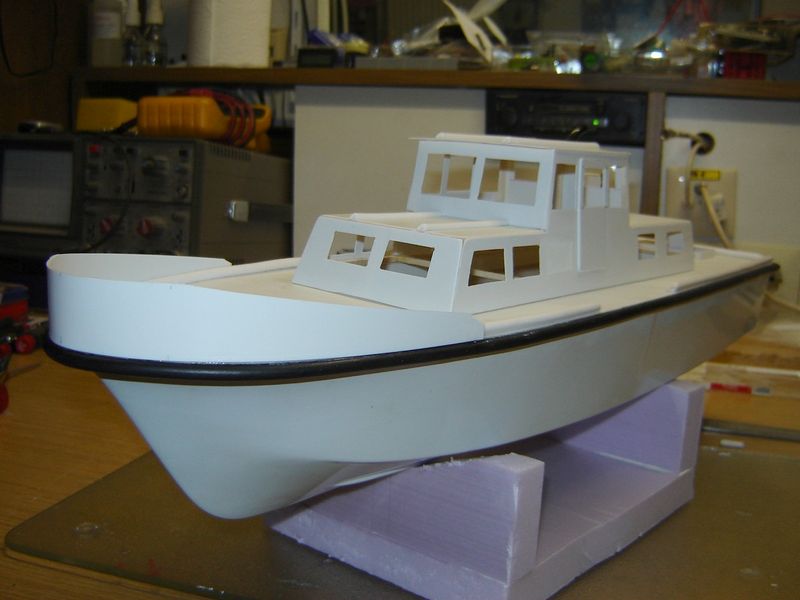 Die Decksplatte ist mit dem Rumpf verklebt, der Antriebsmotor mit Welle eingebaut und eine Scheuerleiste angebracht.