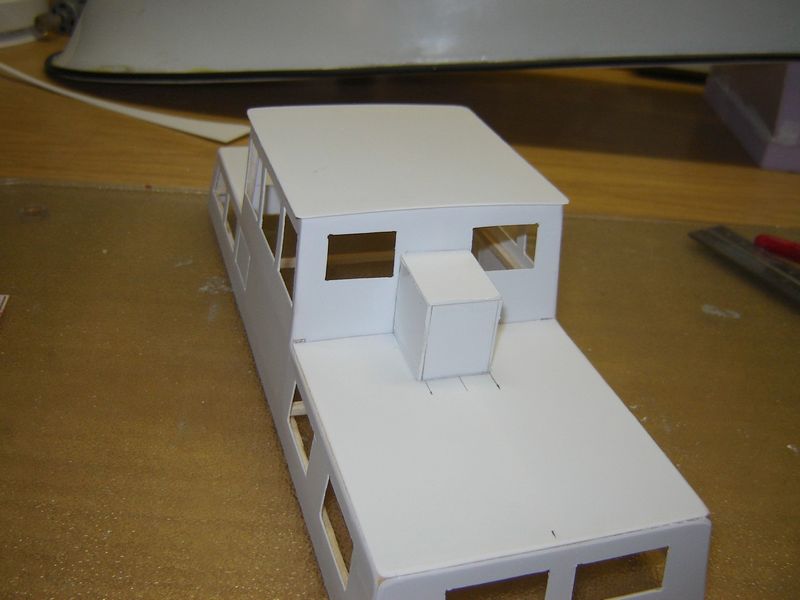 Nach der Erstellung der Grundplatte machte ich mich dann an die Aufbauten. Hierbei hielt ich mich nur un-gefähr an das Vorbild. Aus Polystyrol schnitt ich mir die Seitenwände zurecht und brachte diese mit dünnen Holzleisten in Form.